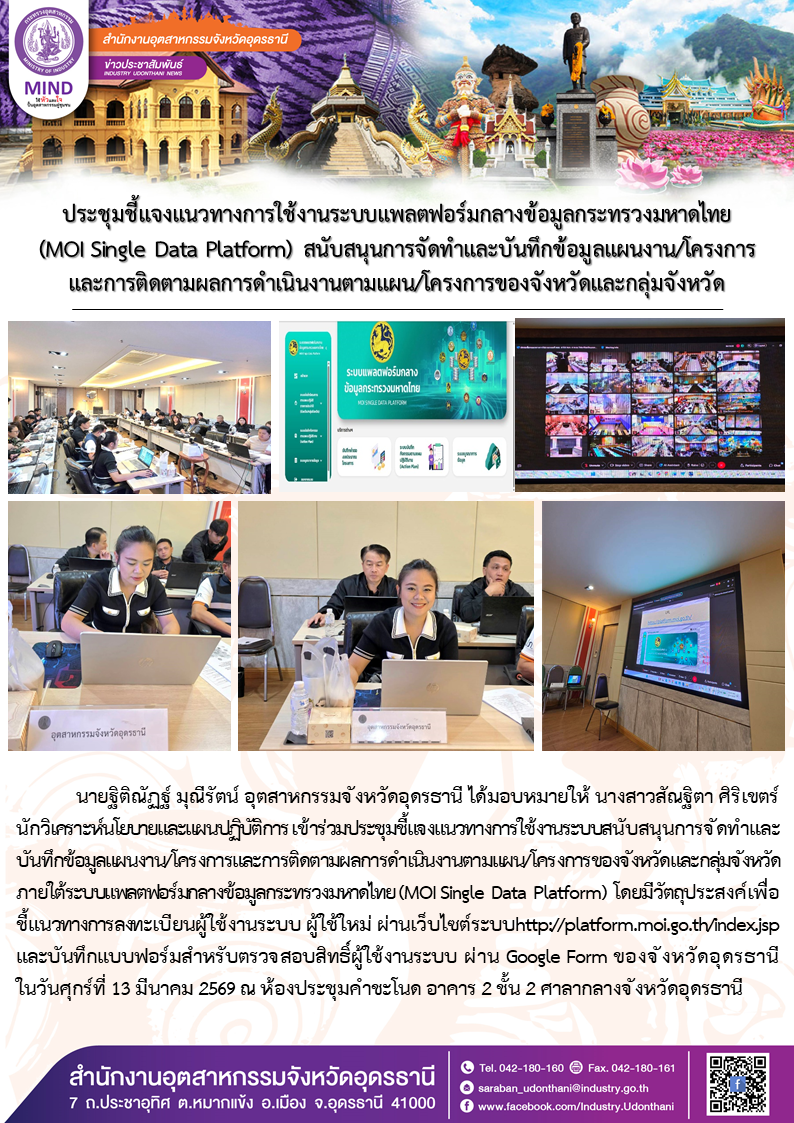 นายฐิติณัฏฐ์ มุณีรัตน์ อุตสาหกรรมจังหวัดอุดรธานี ได้มอบหมายให้ นางสาวสัณฐิตา ศิริเขตร์ นักวิเคราะห์นโยบายและแผนปฏิบัติการ เข้าร่วมประชุมชี้แจงแนวทางการใช้งานระบบสนับสนุนการจัดทำและบันทึกข้อมูลแผนงาน/โครงการและการติดตามผลการดำเนินงานตามแผน/โครงการของจังหวัดและกลุ่มจังหวัด ภายใต้ระบบแพลตฟอร์มกลางข้อมูลกระทรวงมหาดไทย (MOI Single Data Platform) โดยมีวัตถุประสงค์เพื่อ ชี้แนวทางการลงทะเบียนผู้ใช้งานระบบ ผู้ใช้ใหม่ ผ่านเว็บไซต์ระบบhttp://platform.moi.go.th/index.jsp และบันทึกแบบฟอร์มสำหรับตรวจสอบสิทธิ์ผู้ใช้งานระบบ ผ่าน Google Form ของจังหวัดอุดรธานี ในวันศุกร์ที่ 13 มีนาคม 2569 ณ ห้องประชุมคำชะโนด อาคาร 2 ชั้น 2 ศาลากลางจังหวัดอุดรธา