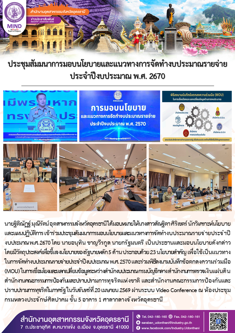นายฐิติณัฏฐ์ มุณีรัตน์ อุตสาหกรรมจังหวัดอุดรธานี ได้มอบหมายให้นางสาวสัณฐิตา ศิริเขตร์ นักวิเคราะห์นโยบายและแผนปฏิบัติการ เข้าร่วมประชุมสัมมนาการมอบนโยบายและแนวทางการจัดทำงบประมาณรายจ่ายประจำปี งบประมาณ พ.ศ. 2670 โดย นายอนุทิน ชาญวีรกูล นายกรัฐมนตรี เป็นประธานและมอบนโยบายดังกล่าว โดยมีวัตถุประสงค์เพื่อชี้แจงนโยบายของรัฐบายหลัก 5 ด้าน ประกอบด้วย 23 นโยบายสำคัญ เพื่อใช้เป็นแนวทาง ในการจัดทำงบประมาณรายจ่ายประจำปีงบประมาณ พ.ศ. 2570 และร่วมพิธีลงนามบันทึกข้อตกลงความร่วมมือ (MOU) ในการเชื่อมโยงและแลกเปลี่ยนข้อมูลระหว่างสำนักงบประมาณ กรมบัญชีกลาง สำนักงานการตรวจเงินแผ่นดิน สำนักงานคณะกรรมการป้องกันและปราบปรามการทุจริตแห่งชาติ และสำนักงานคณะกรรมการป้องกันและปราบปรามการทุจริตในภาครัฐ ในวันจันทร์ที่ 20 เมษายน 2569 ผ่านระบบ Video Conference ณ ห้องประชุมกรมหลวงประจักษ์ศิลปาคม ชั้น 5 อาคาร 1 ศาลากลางจังหวัดอุดรธานี